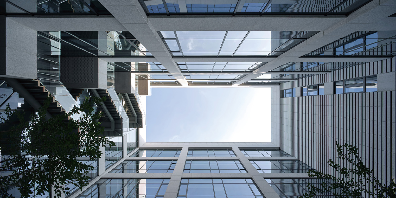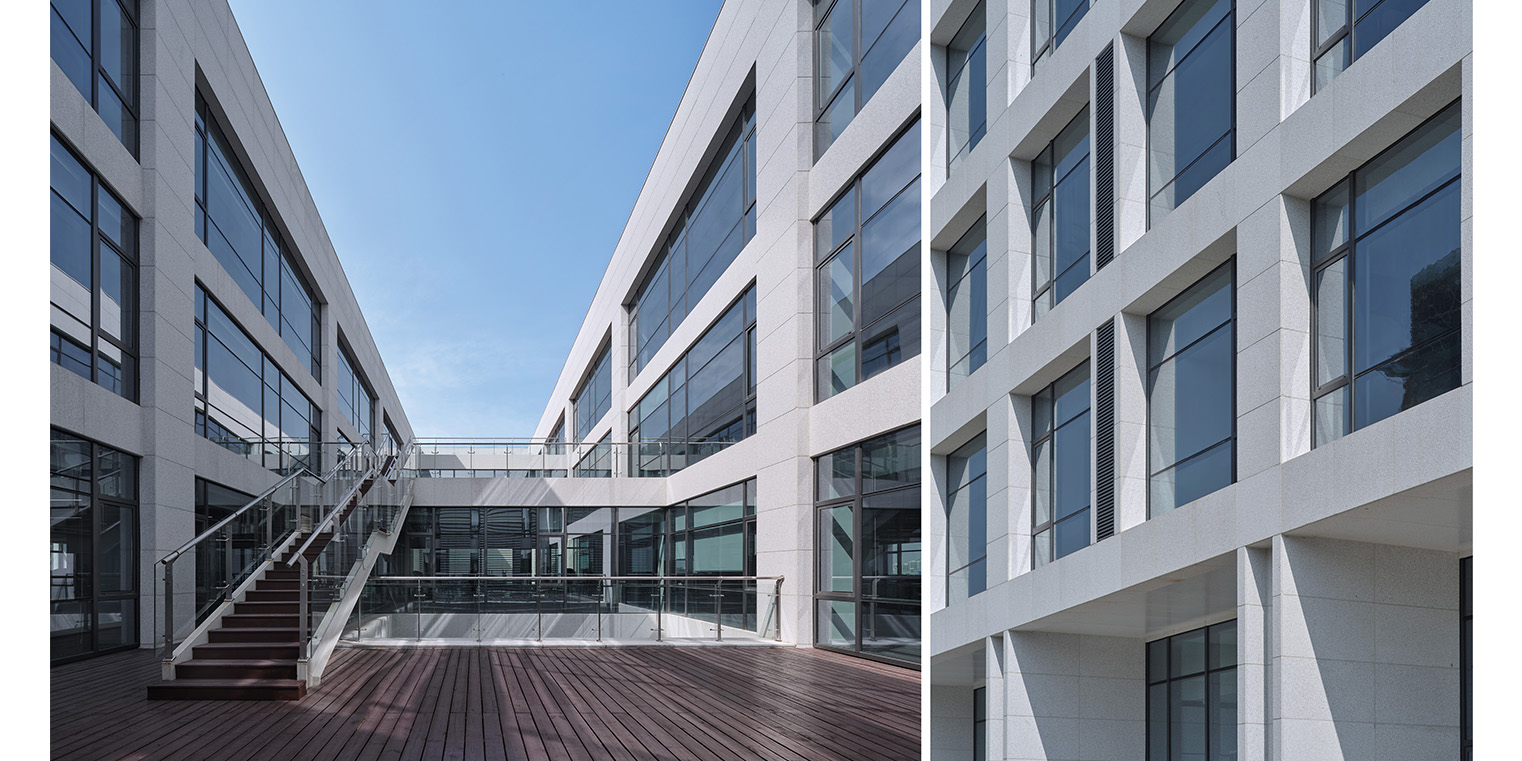 在尊重園區(qū)建筑整體設(shè)計(jì)風(fēng)格的前提下,我們以單純方整的形體回應(yīng)場(chǎng)地狹長(zhǎng)的特性,每個(gè)體量都如雕塑一般,較小的體形系數(shù)保證節(jié)能的同時(shí)也實(shí)現(xiàn)了高利用率的樓內(nèi)辦公空間。 建筑內(nèi)部多種功能空間相互獨(dú)立,互不影響,空間圍繞景觀中庭展開(kāi),同時(shí)結(jié)合貫穿在中庭景觀中的空中平臺(tái)和架空的連廊形成立體化的內(nèi)部步行系統(tǒng)。創(chuàng)造參與性強(qiáng),多樣性,多元化的空間體驗(yàn)。