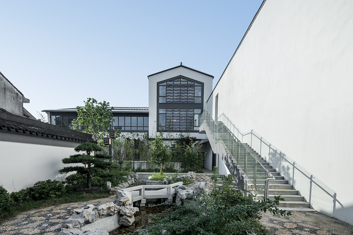 設(shè)計團(tuán)隊(duì)在尊重周邊整體建筑風(fēng)格的前提下,運(yùn)用大體量與小尺度相結(jié)合的園林化設(shè)計手法,在建筑底部置入完整的空間以滿足建筑的公共功能的需要,其上以小體量形體回應(yīng)特殊的場地,延續(xù)古城肌理。在整體環(huán)境中運(yùn)用坡屋頂、粉墻黛瓦、花窗等蘇式傳統(tǒng)建筑的經(jīng)典符號,營造既有歷史感,又有親切尺度的建筑空間系列。從中國古典園林空間汲取智慧,提出園林化空間的概念,利用院落空間與園林文化對古城肌理積極回應(yīng),在方寸中營造空間的靈活多變。路徑與中心廣場收放達(dá)到曲徑通幽、欲揚(yáng)先抑的設(shè)計目的。引入院落,給建筑以可供“呼吸”的天井空間,不僅獲得更好的光照效果,同時分散了建筑體量與周邊環(huán)境更加協(xié)調(diào)。造園、布景,室內(nèi)外空間形成良好的景觀互動。