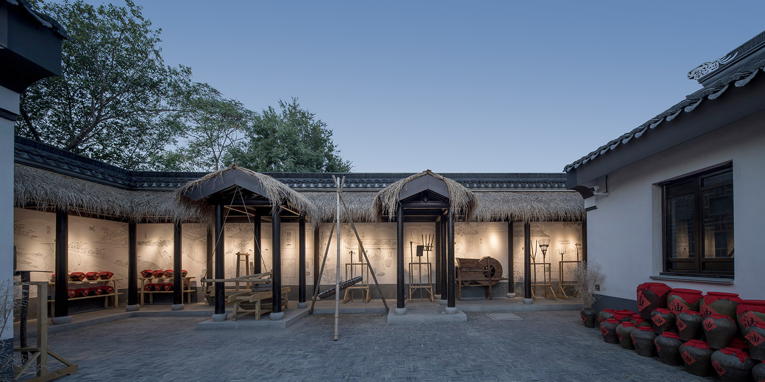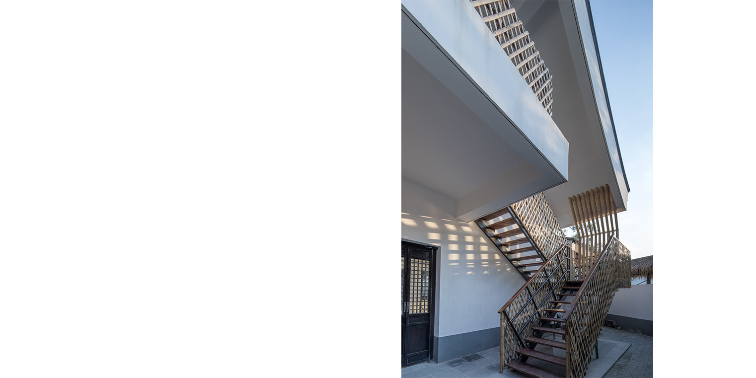 項(xiàng)目選址在馮夢(mèng)龍紀(jì)念館西南側(cè)的一戶廢棄農(nóng)宅,西側(cè)和北側(cè)為村莊道路,東側(cè)緊鄰一戶還在使用的農(nóng)宅,南側(cè)為農(nóng)作物晾曬場(chǎng)地。設(shè)計(jì)維持原有場(chǎng)地的場(chǎng)所感,保留了原有場(chǎng)地的空間記憶,同時(shí)還合理地植入了“油坊”這一全新的功能業(yè)態(tài)。因?yàn)橹踩肓恕坝头弧边@一帶有生產(chǎn)加工性質(zhì)的功能,所以必然會(huì)涉及到工藝流線,同時(shí)考慮游客的參觀游線,本項(xiàng)目的建筑設(shè)計(jì)便以流線為主導(dǎo),串聯(lián)各功能房間,以達(dá)到一個(gè)形式與功能相結(jié)合的有機(jī)整體。 為體現(xiàn)村舍的本真面貌,我們始終采用低技、鄉(xiāng)土的建造手段。土建部分我們采用最低等級(jí)的古建制式,省去大量繁復(fù)的木構(gòu)、石作、瓦作做法。同時(shí)大量采用鄉(xiāng)土料作為建筑構(gòu)件。如西側(cè)由石材、木構(gòu)架與油罐組合而成的景觀院墻;院內(nèi)外兩條純木結(jié)構(gòu)的木廊架以及覆蓋廊架的真實(shí)茅草,鋼結(jié)構(gòu)樓梯中用竹編制成的欄桿扶手。