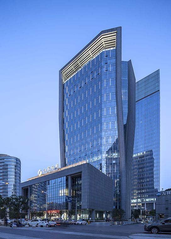 征,以符合當(dāng)?shù)靥厣慕ㄖ螒B(tài)和立面設(shè)計(jì)。設(shè)計(jì)受江蘇銀行行徽的啟發(fā),突破周邊方盒子式的高層建筑群的傳統(tǒng)造型,建筑形體通過(guò)兩個(gè)“J”形體量旋轉(zhuǎn)生成,兩個(gè)體量互相環(huán)抱、不斷攀升,象征著企業(yè)蒸蒸日上的積極形象。