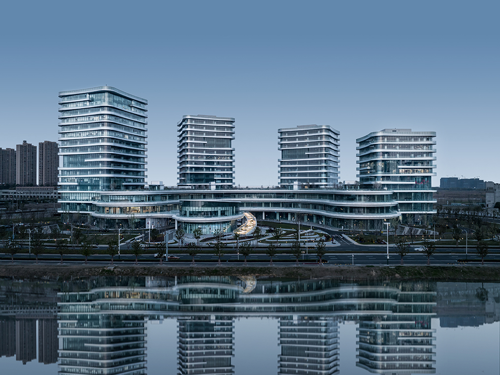 中荷科技創(chuàng)新港位于蘇州高鐵北站以北、環(huán)秀湖以東,由弧形裙房+四棟塔樓組成。項目圍繞“創(chuàng)新港”主題,打造港灣式科研社區(qū),裙房通過退臺形式對城市界面和景觀湖面展開,塔樓在重點視角設置共享空間,并結合橫向線條形成富有韻律變化的互聯(lián)場所,豐富整個城市形象。
