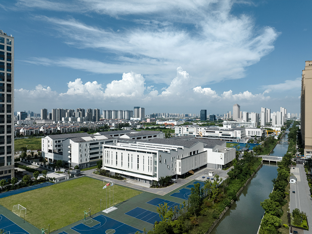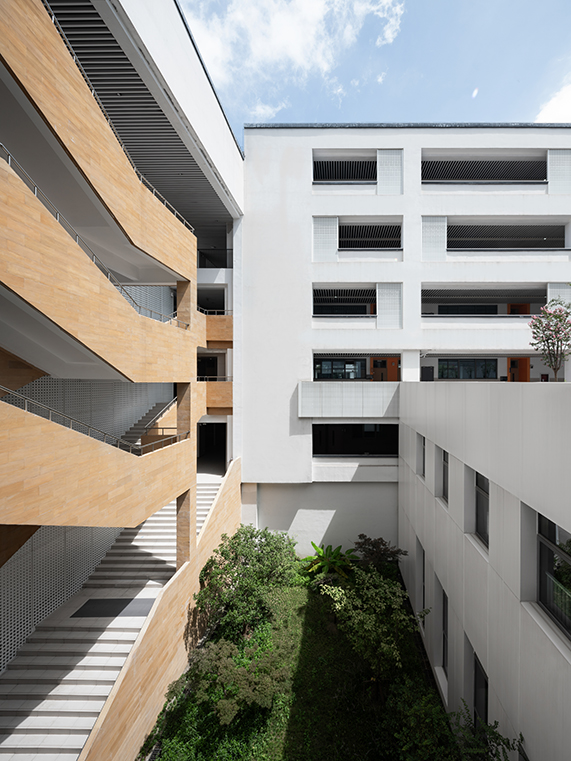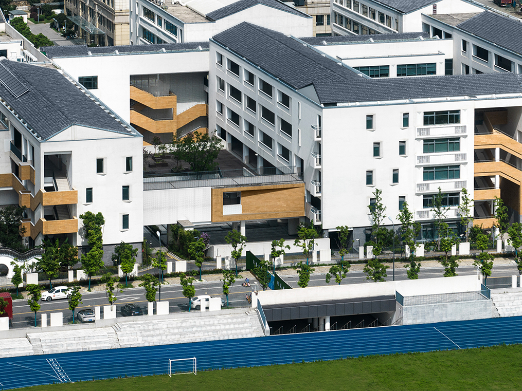 傳統(tǒng)的條形教室以走廊串聯(lián)的模式限制了校園空間格局形式并不適用于本方案,在日照的限制下,以功能環(huán)串聯(lián)交融為構(gòu)成手段的布局,不僅將集約高效率的教學(xué)模式演繹透徹,還創(chuàng)造出多樣的廣場(chǎng)、庭院空間。
