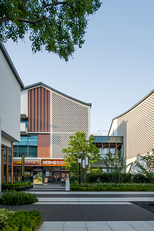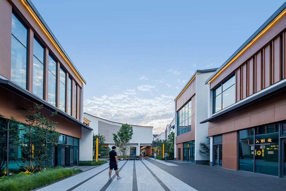 街區(qū)建筑采用精細(xì)化、蘇而新的設(shè)計(jì)手法,將現(xiàn)代玻璃材質(zhì)與白墻黛瓦的江南建筑元素相結(jié)合,形成虛與實(shí),現(xiàn)代與古樸融合相間的形式。功能上利用基地獨(dú)有特征,采用線型模式進(jìn)行布局,在近250米長的用地中設(shè)計(jì)出三個(gè)區(qū)域,營造多處游客休憩場所,并通過人車分流的方式優(yōu)化交通流線,真正營造一個(gè)休閑、自由徜徉的街道環(huán)境。