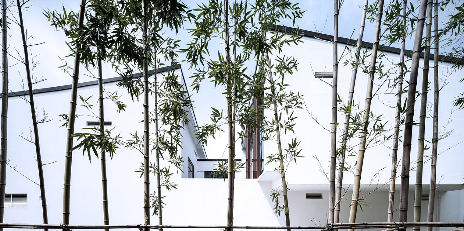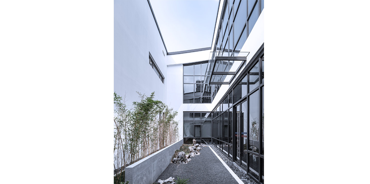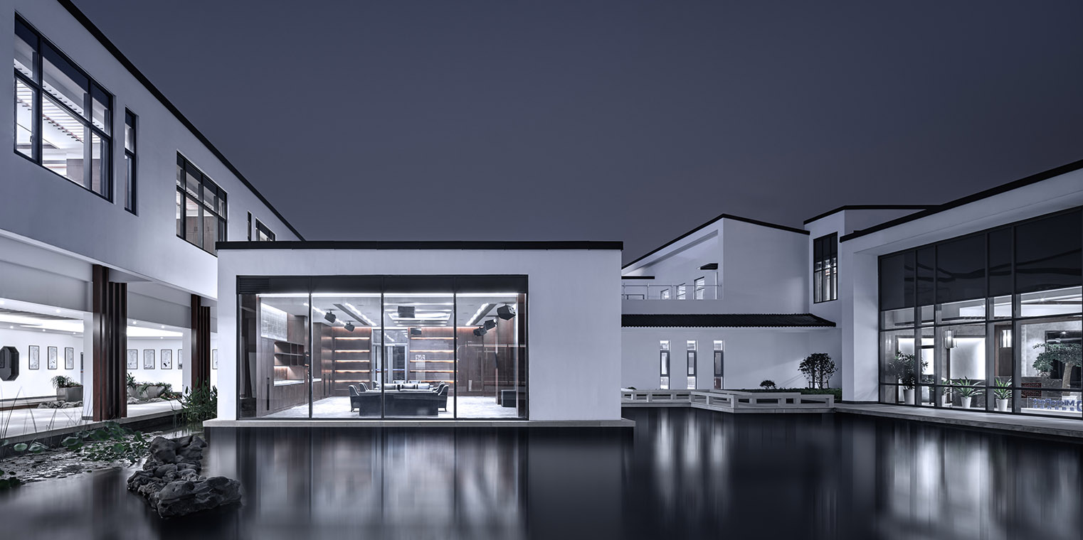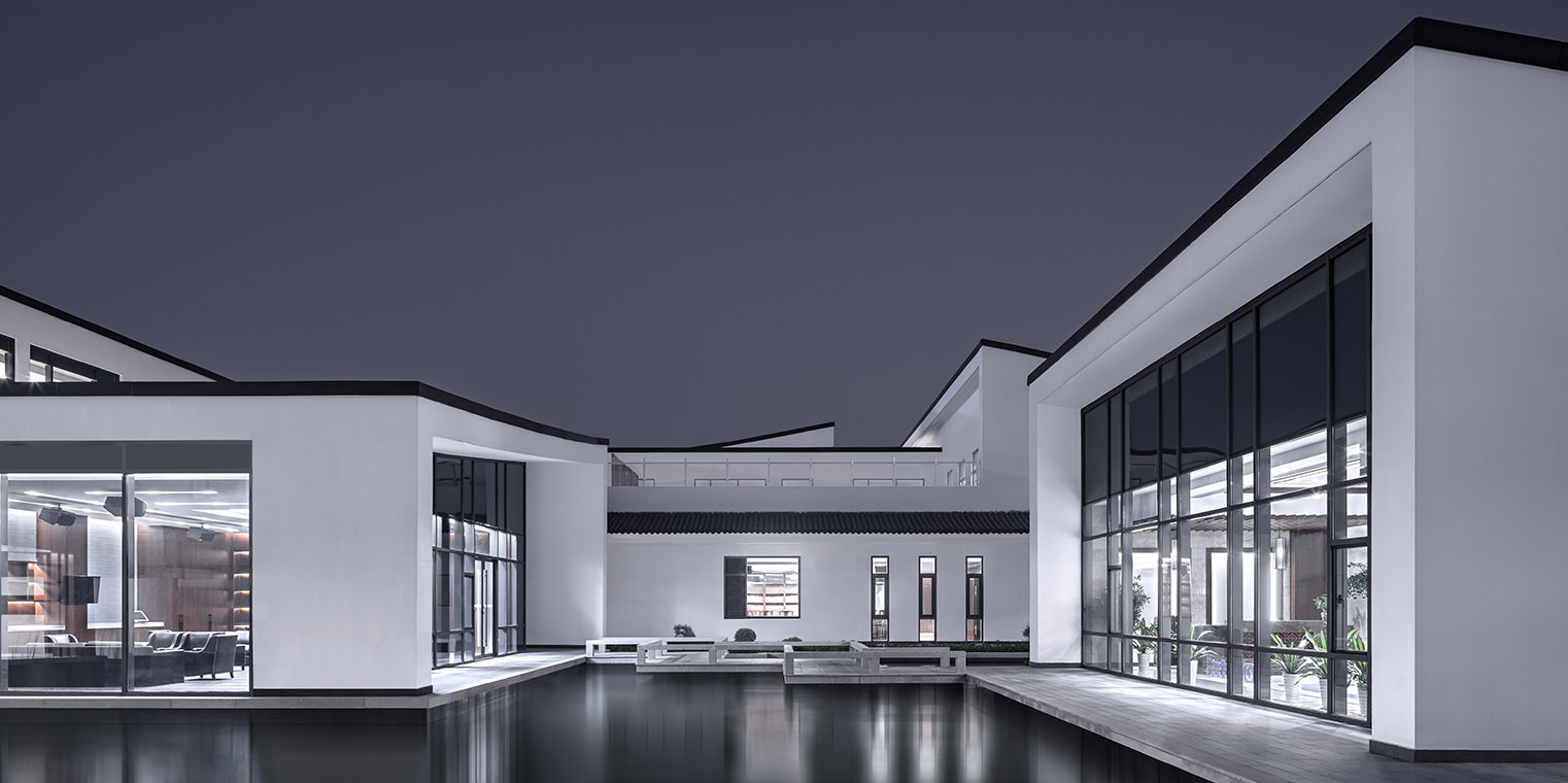項(xiàng)目對中國傳統(tǒng)建筑園林空間中“半房半院”的組織手法加以傳承和演繹,在場地正交網(wǎng)格體系中選取U型建筑體量作為基本的模塊單元,加以重復(fù)、組合滿足多重功能需求,U型建筑單體圍合成多個(gè)院落空間,并相互滲透、疊院成園,營造出園院相嵌、圍而不隔的園林化辦公環(huán)境。 建筑形式采用傳統(tǒng)中式建筑意向,結(jié)合現(xiàn)代的處理手法,與蘇州整體的建筑景觀相融合。屋面形式呼應(yīng)傳統(tǒng)山水,采用概括提煉手法,用曲折的屋面模擬連綿起伏的自然山脈,力求體現(xiàn)自然山巒的形態(tài)和神韻;白色涂料墻面與灰色瓦屋面,回應(yīng)了傳統(tǒng)建筑的粉墻黛瓦,搭配局部的仿木材質(zhì)與竹子等裝飾構(gòu)建,回應(yīng)傳統(tǒng)建筑中的木構(gòu)特征。整座建筑從空間到形式,既蘊(yùn)含了傳統(tǒng)建筑的神韻,又兼?zhèn)淞爽F(xiàn)代建筑的精神。
