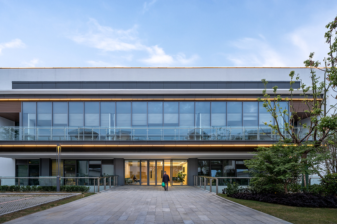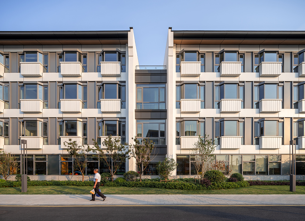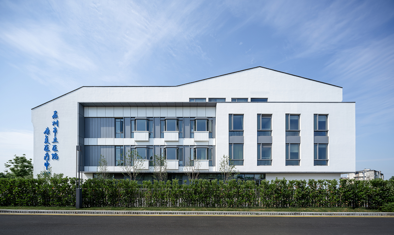 建筑整體上呈兩個(gè)高低體量并行布置,滿足規(guī)劃限制高度,布局順應(yīng)地形伸展開來,使病房更易獲得最佳日照,擁有最開闊的護(hù)城河景觀視野,同時(shí)形成中軸對(duì)稱的建筑形態(tài)。建筑從蘇州傳統(tǒng)建筑中提取靈感,并結(jié)合現(xiàn)代的處理方式將其優(yōu)化,蘇式韻味藏于建筑的意形之間,與古城風(fēng)貌和諧相融。